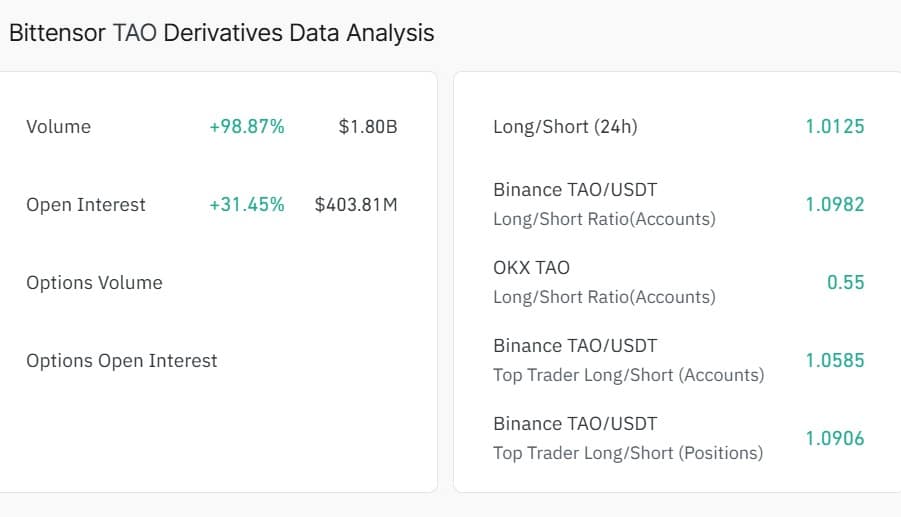 Setelah menembus level resistance kunci $300, di tengah breakout pasar yang lebih luas, TAO melihat permintaan besar, terutama dari trader ritel. Peningkatan permintaan memperkuat momentum kenaikan.