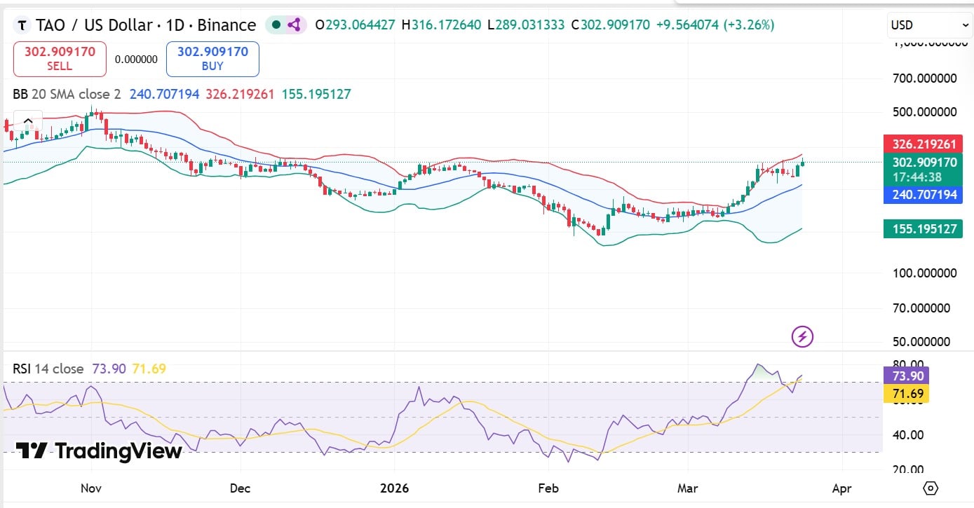 Pada saat penulisan, TAO diperdagangkan pada $308, naik 12,15% pada grafik harian. Dalam jangka waktu yang sama, volume perdagangan altcoin ini melonjak 122% menjadi $655 juta, mencerminkan peningkatan partisipasi pasar.