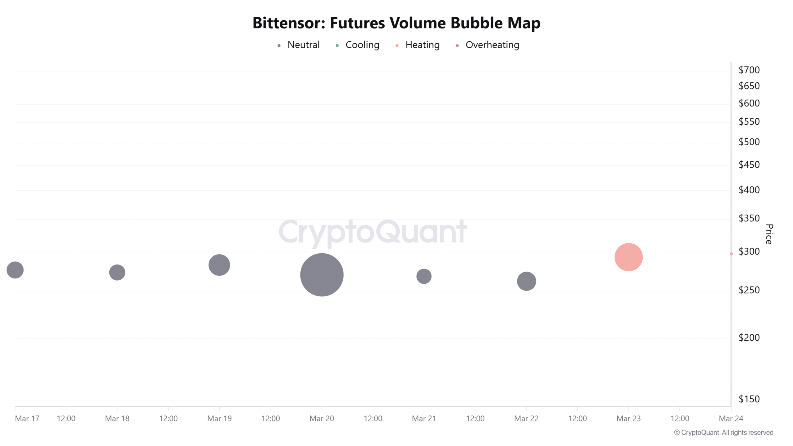 TAO mencetak keuntungan signifikan, sebagian besar didorong oleh minat spekulatif baru karena pembeli terlambat mencoba membeli dalam reli. Peta Gelembung Volume Futures menunjukkan kondisi pasar yang terlalu panas, mencerminkan FOMO yang meningkat karena terlalu banyak trader masuk ke posisi dengan leverage.