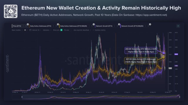 Menggunakan rata-rata 30 hari, telah terjadi peningkatan alamat segar dan aktivitas jaringan setiap hari. Grafik yang dibagikan oleh Santiment menunjukkan bahwa ada lebih dari 837.200 alamat dompet ETH aktif per hari, mewakili kenaikan lebih dari 80% dibandingkan dengan 5 tahun yang lalu.