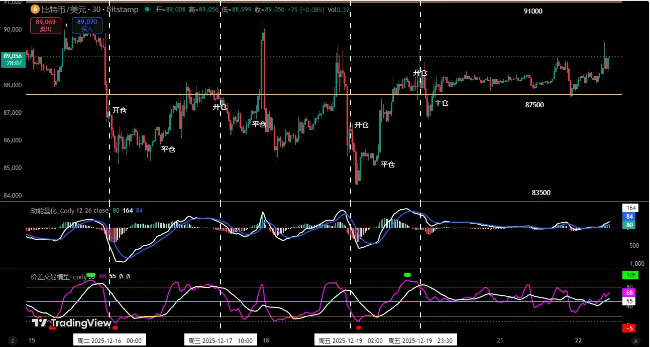 • Transaksi kedua dan ketiga (untung kumulatif 1,41%): Berdasarkan mode operasi "memantul ke area tekanan inti, menghadapi hambatan, short jual". Ketika harga koin menyerang area 87.500~89.000 dolar AS dan menghadapi hambatan, ditambah dengan sinyal resonansi dari dua model, berhasil menyelesaikan dua transaksi ini.