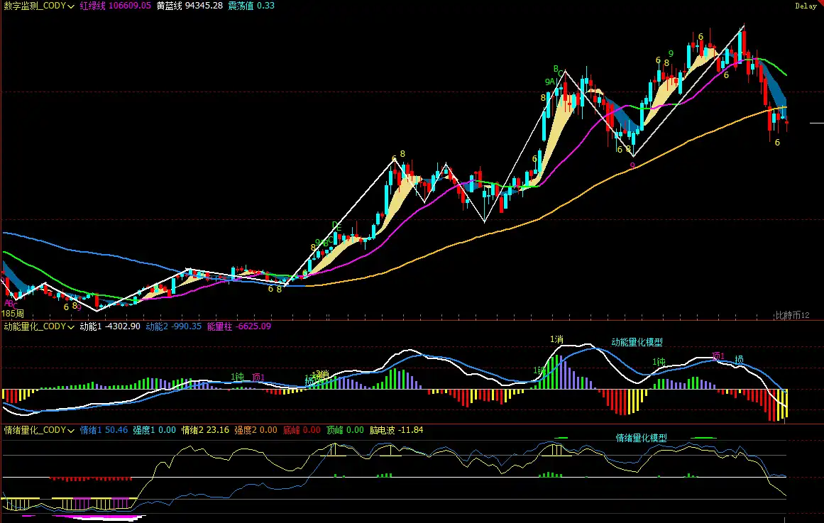 • Model Pemantauan Digital: Ditunjukkan dalam gambar, harga koin telah jatuh di bawah garis pemisah bull-bear (kuning-biru) selama 5 minggu, probabilitas terputus efektif meningkat. Sinyal digital dasar jangka pendek (9 atau lebih) belum muncul.