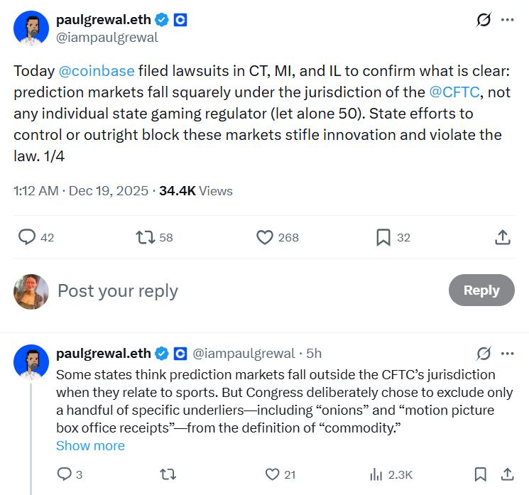 Dalam postingan X pada hari Jumat, kepala petugas hukum Paul Grewal mengatakan Coinbase mengajukan kasus-kasus ini "untuk mengonfirmasi apa yang sudah jelas: pasar prediksi sepenuhnya berada di bawah yurisdiksi @CFTC, bukan regulator perjudian negara bagian mana pun (apalagi 50)."