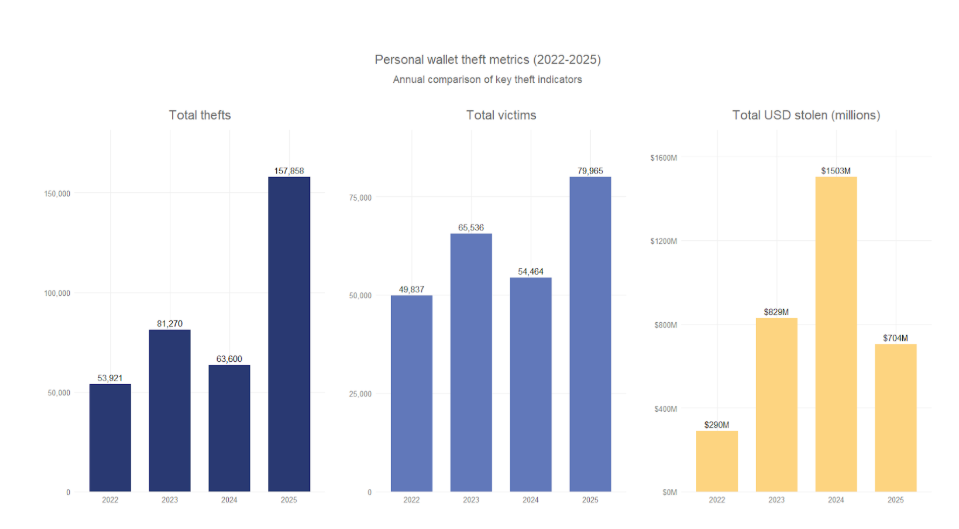Namun, jumlah keseluruhan yang dicuri dari peretasan individu menurun dari $1,5 miliar pada tahun 2024 menjadi $713 juta tahun ini, meskipun jumlah insiden hampir tiga kali lipat dibandingkan dengan tahun 2022.