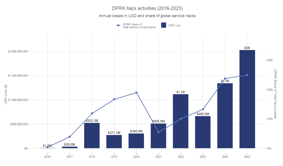 Analisis menemukan bahwa peretas Korea Utara melakukan lebih sedikit serangan tetapi jauh lebih merusak pada tahun 2025, yang Chainalysis atributkan kepada peningkatan kecanggihan dan kesabaran karena mereka lebih fokus pada mencapai skor yang lebih besar.