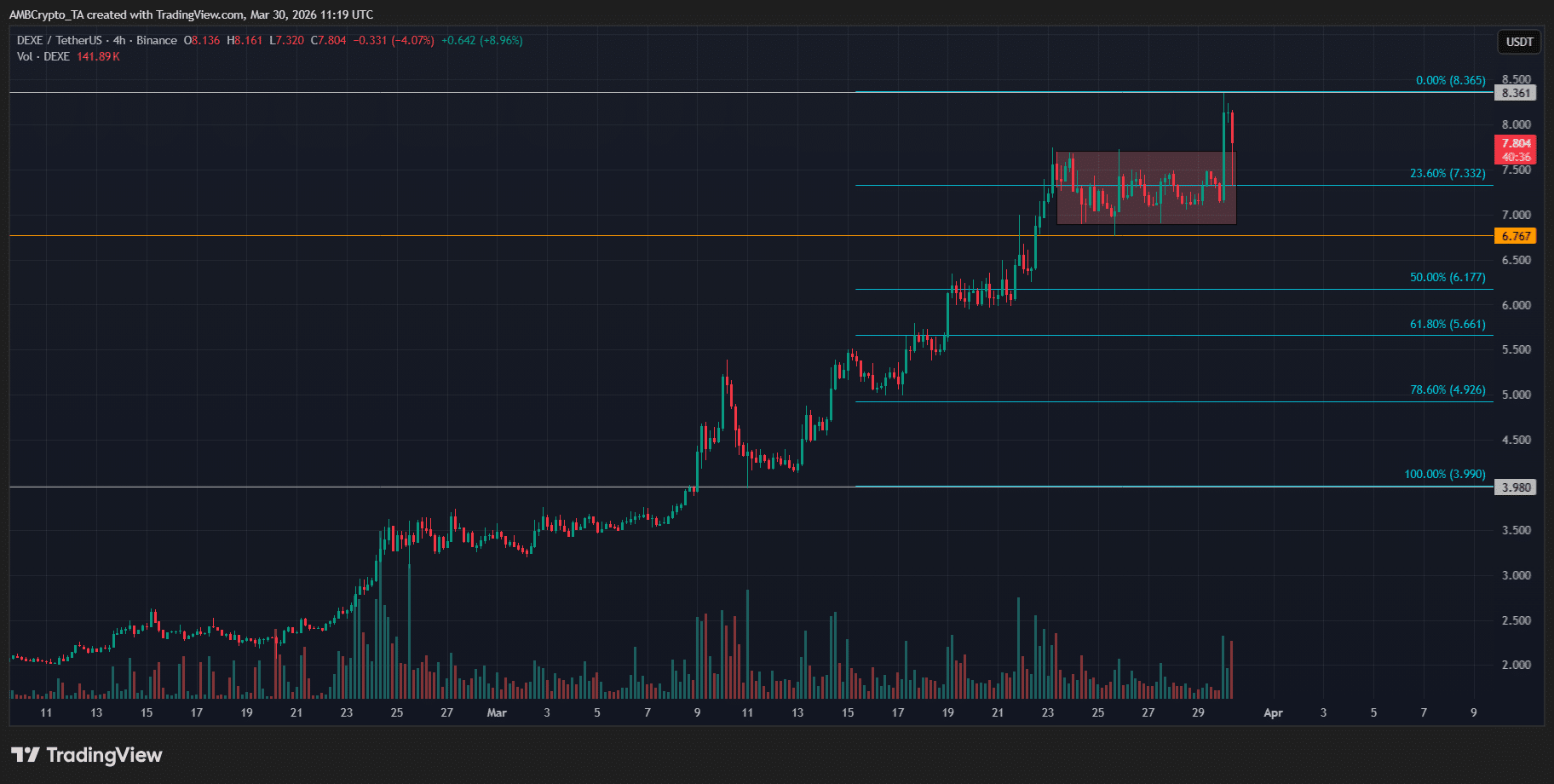 Aksi harga Dexe [DEXE] menunjukkan permintaan yang kembali setelah periode kelemahan yang panjang. Harga membuka tren naik di sekitar $7.165, turun ke $7.134, kemudian naik tajam ke $8.350 sebelum ditutup sekitar $8.119, mendapatkan keuntungan 13.36% dalam sehari.