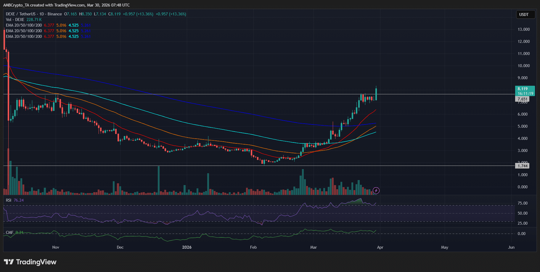 DEXE menunjukkan momentum yang kuat, dengan RSI berkisar di sekitar 76.24, sementara CMF di 0.21 menunjukkan arus masuk modal yang stabil. Saat harga menguji kisaran $8.1–$8.3, keuntungan lebih lanjut bergantung pada kekuatan pembelian yang berkelanjutan.