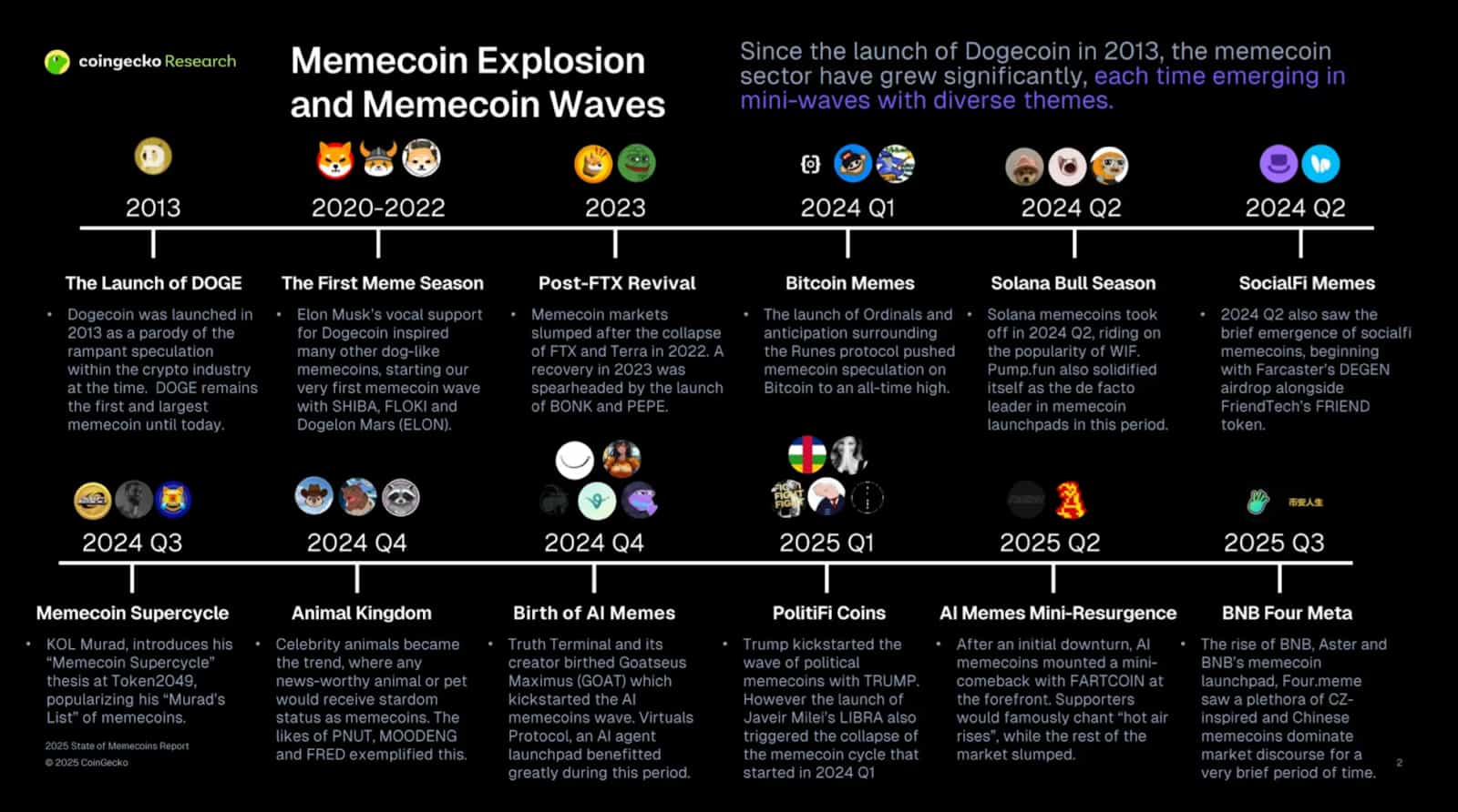 Angka-angka ini menunjukkan bahwa pasar masih memiliki favorit yang jelas, tetapi juga menyoroti bagaimana pendorong momentum bullish sedang berkembang. Linimasa gelombang meme coin dari CoinGecko sendiri mengilustrasikan perubahan ini dengan jelas.