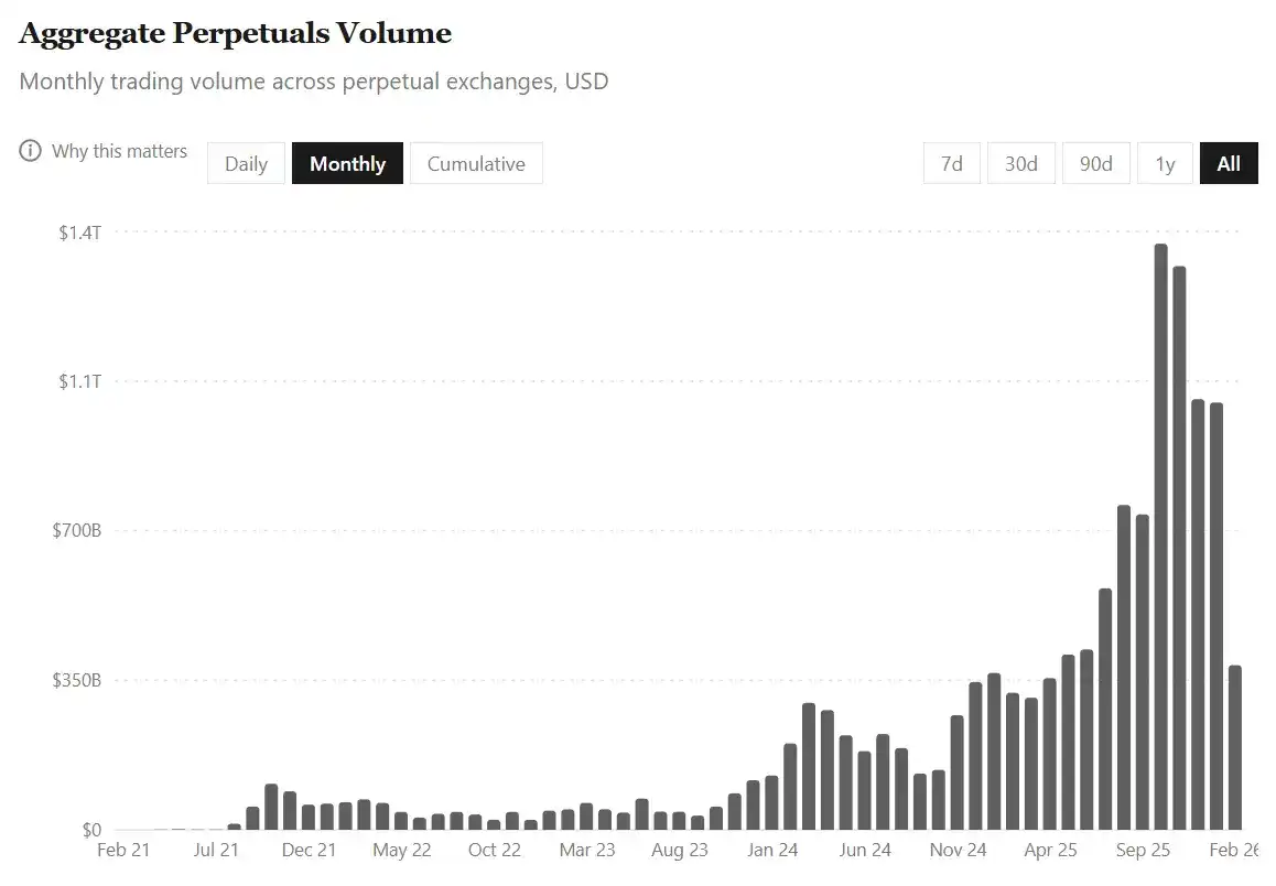 Semua pertumbuhan ini terjadi dengan latar belakang kapitalisasi pasar total cryptocurrency yang menyusut hampir 40% antara 1 Agustus 2025 dan 9 Februari 2026. Aktivitas ini menunjukkan bahwa trader semakin condong ke arah perdagangan derivatif, lindung nilai, dan penentuan posisi jangka pendek, terutama ketika pasar spot menjadi sangat fluktuatif dan bearish.