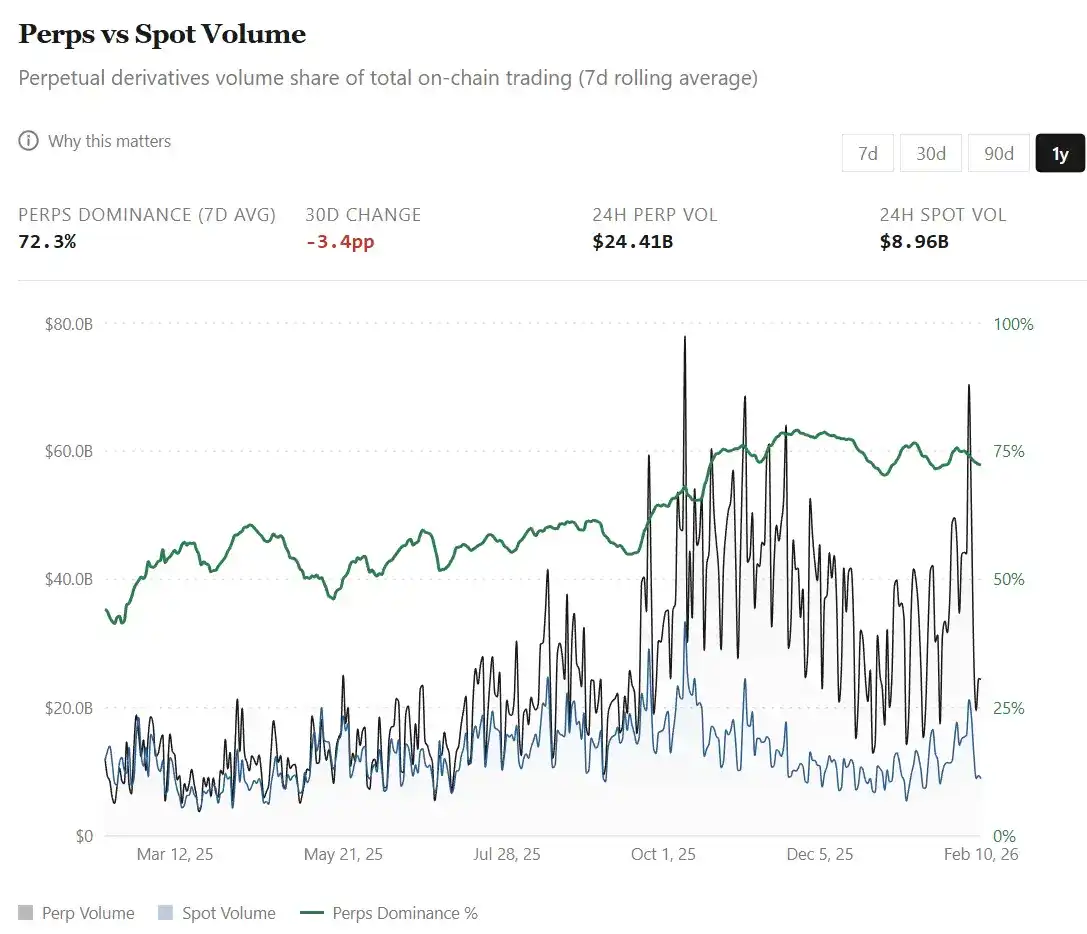 Antarmuka pengguna yang ramah dari pasar perpetual menjadikannya antarmuka default berambang rendah untuk mengekspresikan pandangan di berbagai pasar dan aset global. Pilihan luas untuk perdagangan derivatif berlever tinggi pada aset tradisional dan kripto dalam satu platform telah menyebabkan volume perdagangan perpetual melampaui volume spot di platform perdagangan terdesentralisasi. Dari 44% pada Februari 2025, pangsa volume perpetual telah meroket menjadi sekitar 75% hari ini (relatif terhadap volume spot).