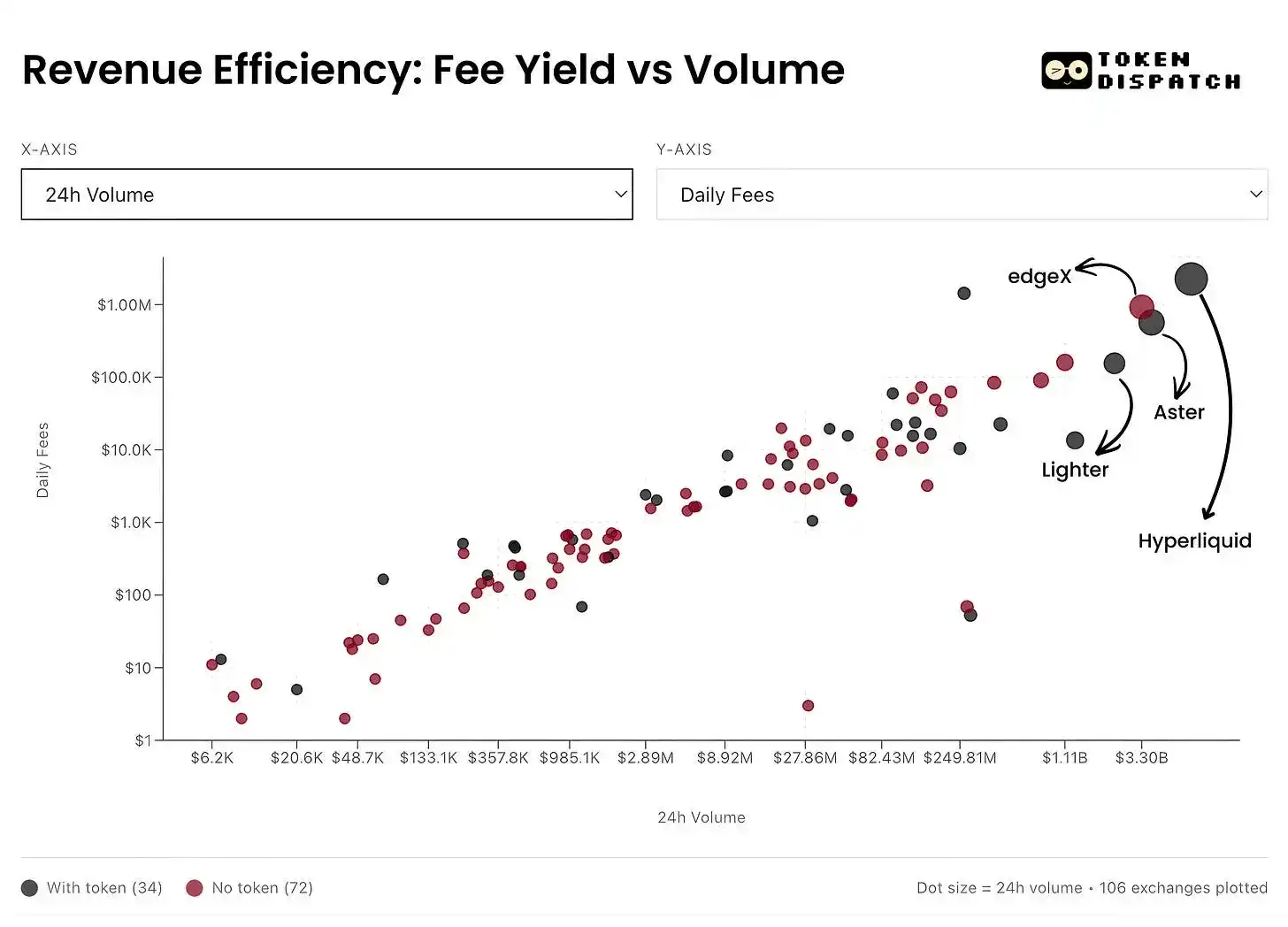 · edgeX & Lighter: Keduanya tampil serupa dalam tangga efisiensi modal, dengan OI/Vol sebesar 21%. Namun, edgeX setara dengan Hyperliquid dalam hal monetisasi fee, yaitu 2.8 bps.