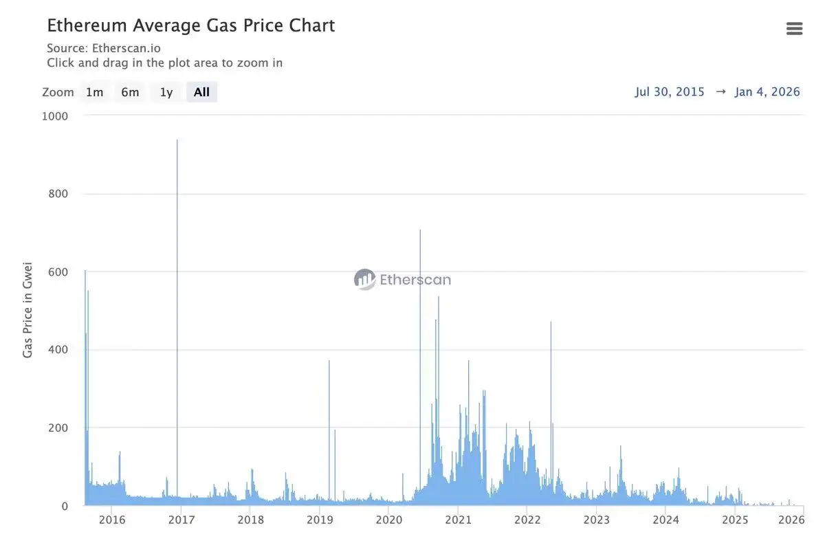 Di saat yang sama,biaya Gas Ethereum mencetak rekor terendah sejak peluncuran mainnet, dan terus memecahkan rekor. Pada某些时段, biaya Gas bahkan di bawah 0,03 Gwei. Mempertimbangkan bahwa Ethereum tahun ini仍将持续 memblokir扩容, tren ini dalam jangka menengah仍具备 ruang延续. Biaya transaksi yang lebih rendah secara langsung akan menurunkan门槛 aktivitas on-chain, dan juga memberikan dasar现实 bagi perluasan berkelanjutan lapisan aplikasi.