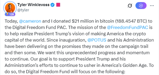 Karena alasan inilah, "loyalitas" industri kripto terhadap Trump sangat tinggi. Sebagian pendiri telah beralih ke PAC yang jelas-jelas pro-Trump seperti Digital Freedom Fund. Pendiri bersama bursa Gemini, Cameron dan Tyler Winklevoss, dalam satu kali sumbangan saja memberikan Bitcoin senilai $21 juta.