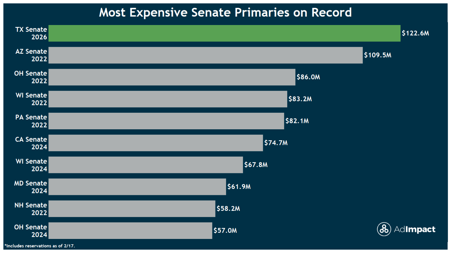 Menurut data dari platform pelacak iklan politik AdImpact, pengeluaran iklan terkait pemilu pendahuluan Senat di Texas saja telah melebihi $122 juta, menjadikannya pemilu pendahuluan Senat termahal sepanjang sejarah.