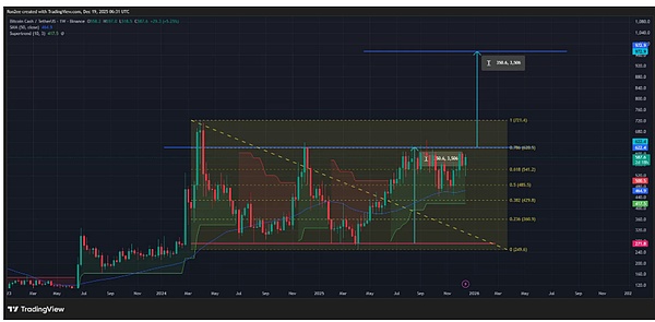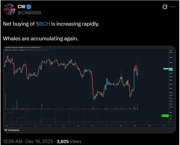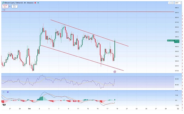 Yang lebih penting, BCH juga membentuk pola double bottom tingkat multi-tahun — ini adalah sinyal teknis bullish yang kuat! Menurut data crypto.news, dalam 24 jam terakhir BCH naik 7.1%, mencapai最高 $585 dalam sehari, naik 28% dari titik terendah November, dan bahkan melonjak 118% dari titik terendah tahun ini.