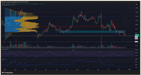Yang paling penting, area support jangka panjang $80-84 yang dipertahankan bull selama dua minggu akhirnya jebol, dan kekuatan bull sangat lemah, bahkan setelah dimasukkan ke dalam indeks ETF 10 kripto Bitwise, harga tidak bereaksi. Dari sisi teknis, tekanan jual tidak berhenti sejak minggu kedua Oktober, dan indikator OBV juga menunjukkan bahwa sebelumnya pembeli dan penjual masih bisa bersaing, tetapi kemudian langsung dihancurkan oleh penjual.