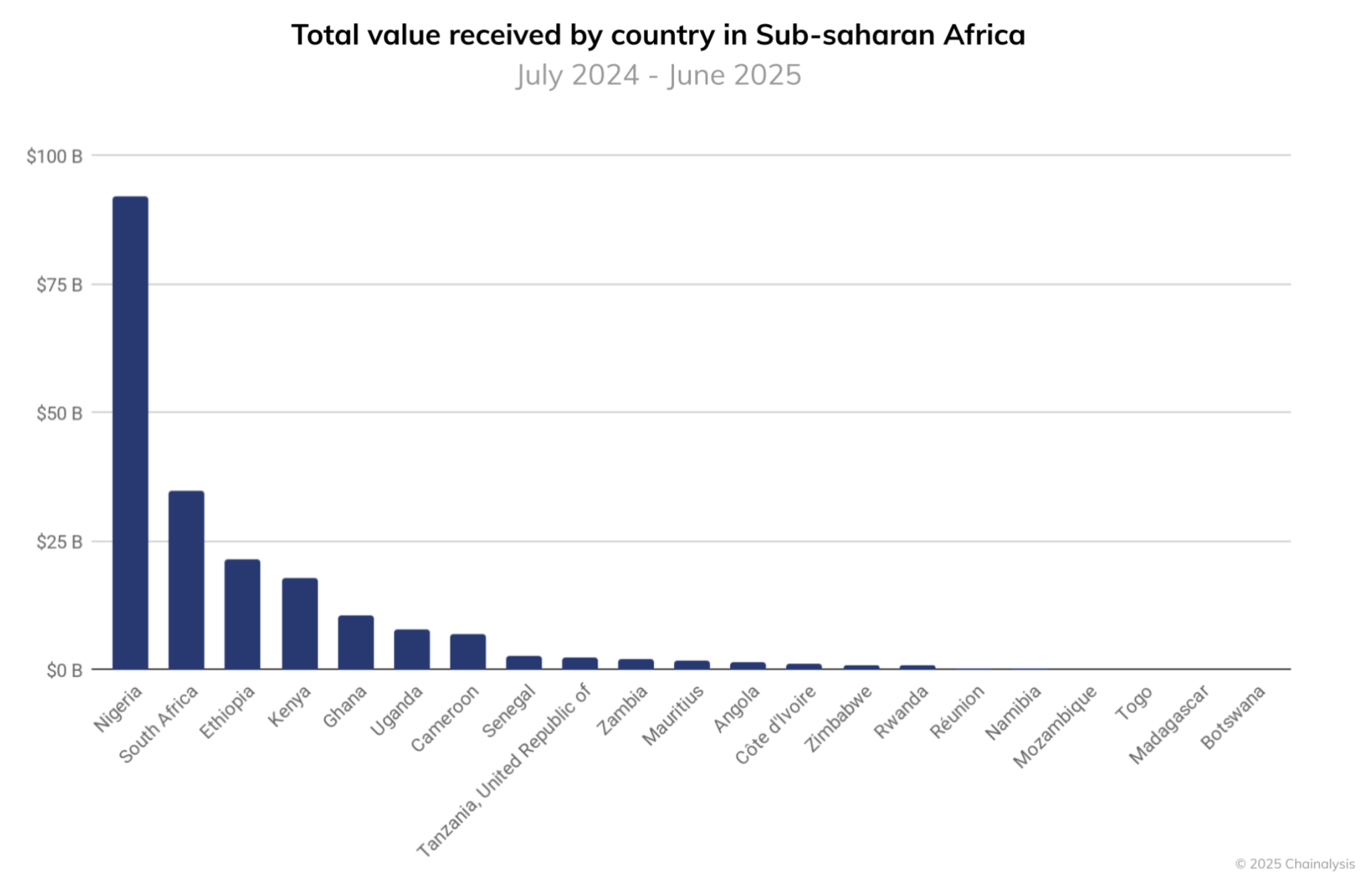 Menurut Laporan Geografi Cryptocurrency 2025 oleh Chainalysis, Ghana masuk dalam lima besar negara Afrika Sub-Sahara berdasarkan total nilai kripto yang diterima antara Juli 2024 dan Juni 2025.