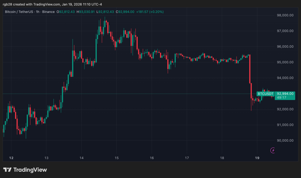 Bitcoin (BTC) diperdagangkan pada $92.994 dalam grafik satu minggu. Sumber: BTCUSDT di TradingView