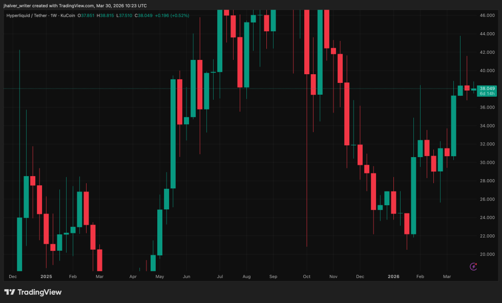 HYPE, token asli Hyperliquid, diperdagangkan pada $38. Sumber: HYPEUSDT di Tradingview