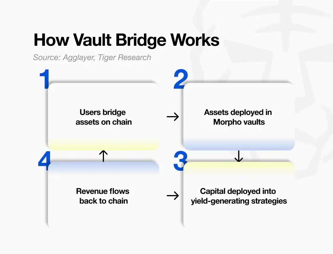Mekanisme pertama adalah Vault Bridge. Ketika pengguna mengirim aset ke Katana, aset asli yang tertinggal di Ethereum mainnet ditempatkan ke pasar peminjaman untuk menghasilkan bunga.
