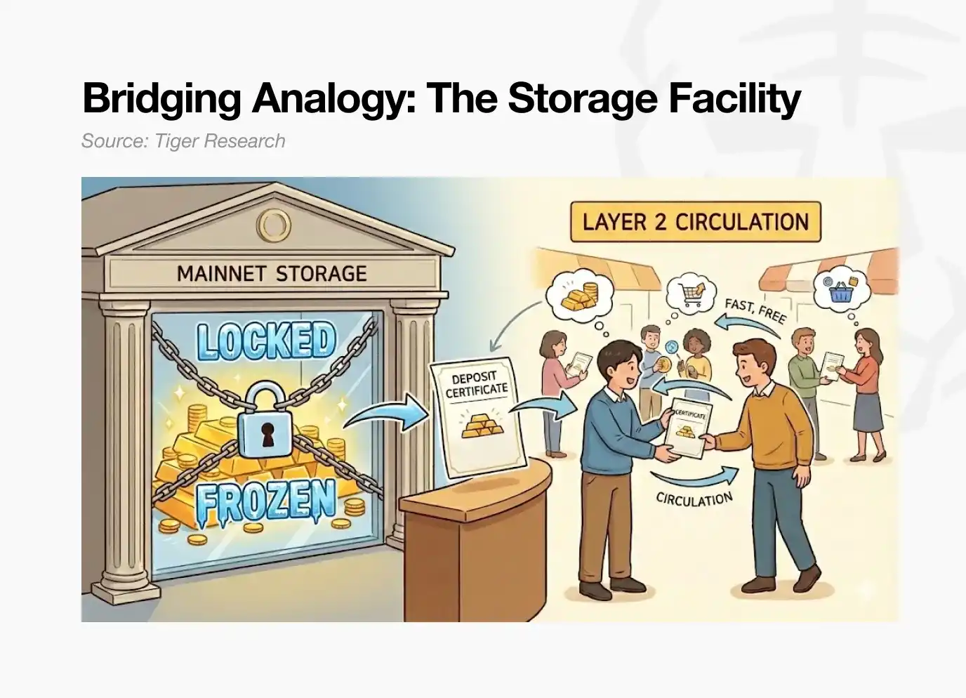 Ini menggambarkan cara kerja kebanyakan bridge Layer 2. Aset yang dijaminkan dalam kontrak escrow Ethereum tidak menghasilkan imbal hasil apa pun. Mereka menunggu secara pasif, sampai pengguna menariknya kembali ke mainnet.
