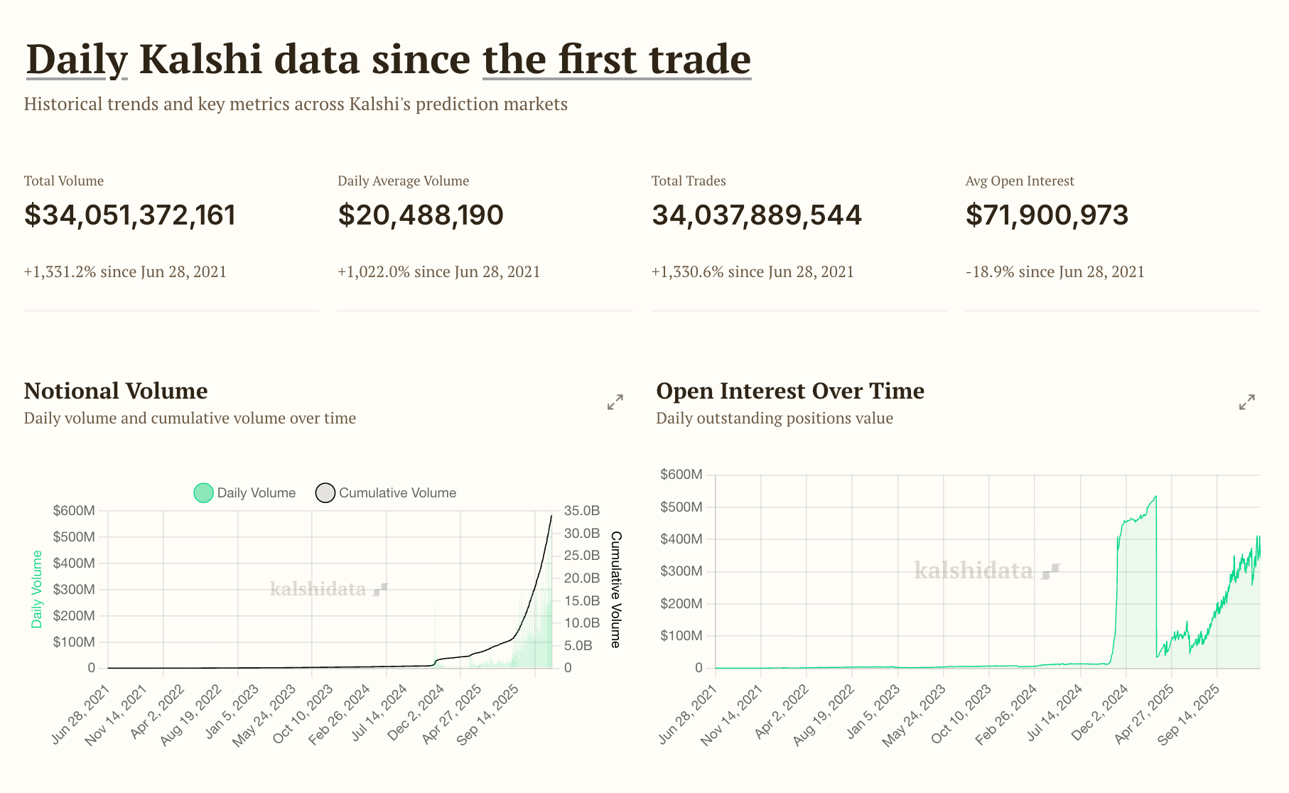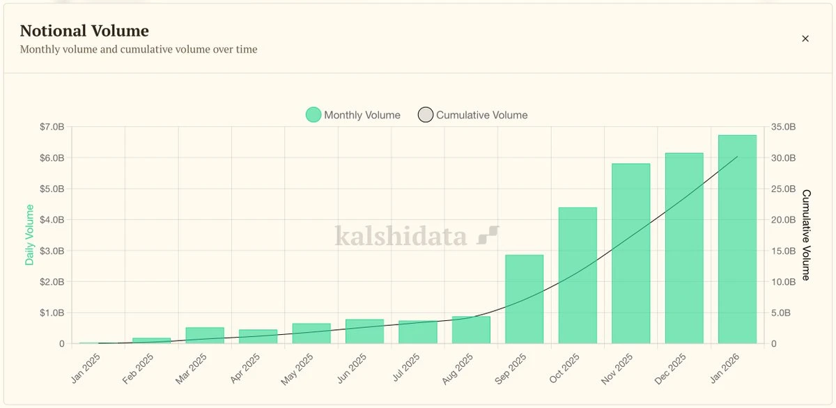 Menurut data situs web KalshiData, per 29 Januari, total volume perdagangan sejarah Kalshi menembus 34,05 miliar dolar AS, volume perdagangan harian rata-rata lebih dari 20,48 juta dolar AS; dan melihat grafik volume perdagangan nominalnya, sejak September 2025, hampir tumbuh secara eksponensial.