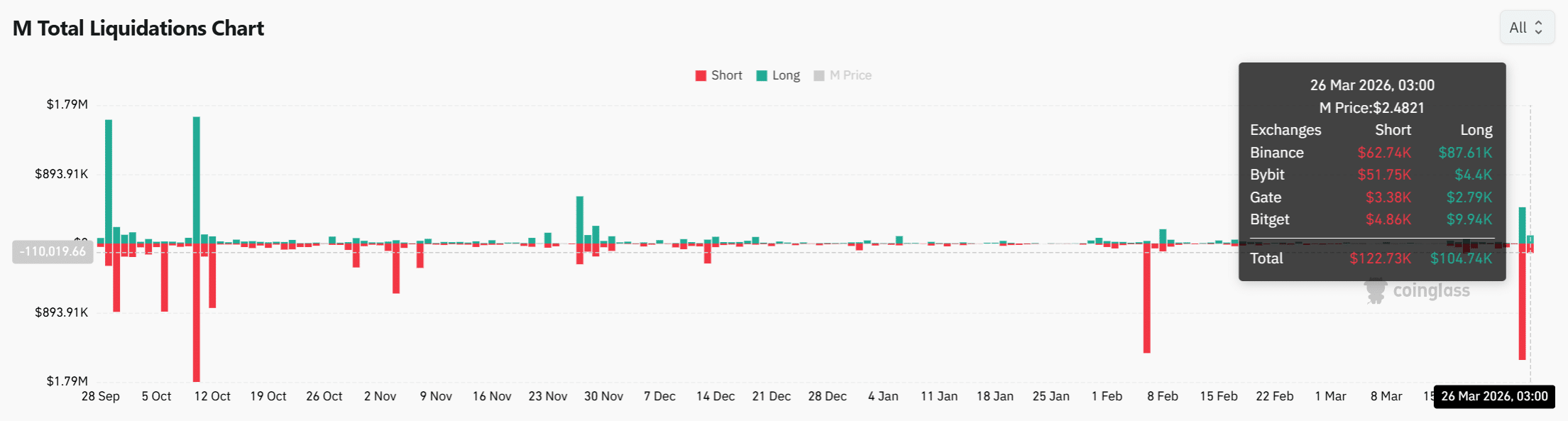 Data likuidasi menunjukkan peningkatan di kedua sisi, dengan total likuidasi short di $122,73K dibandingkan dengan $104,74K dalam likuidasi long, yang menunjukkan tekanan yang lebih kuat secara keseluruhan pada posisi bearish.
