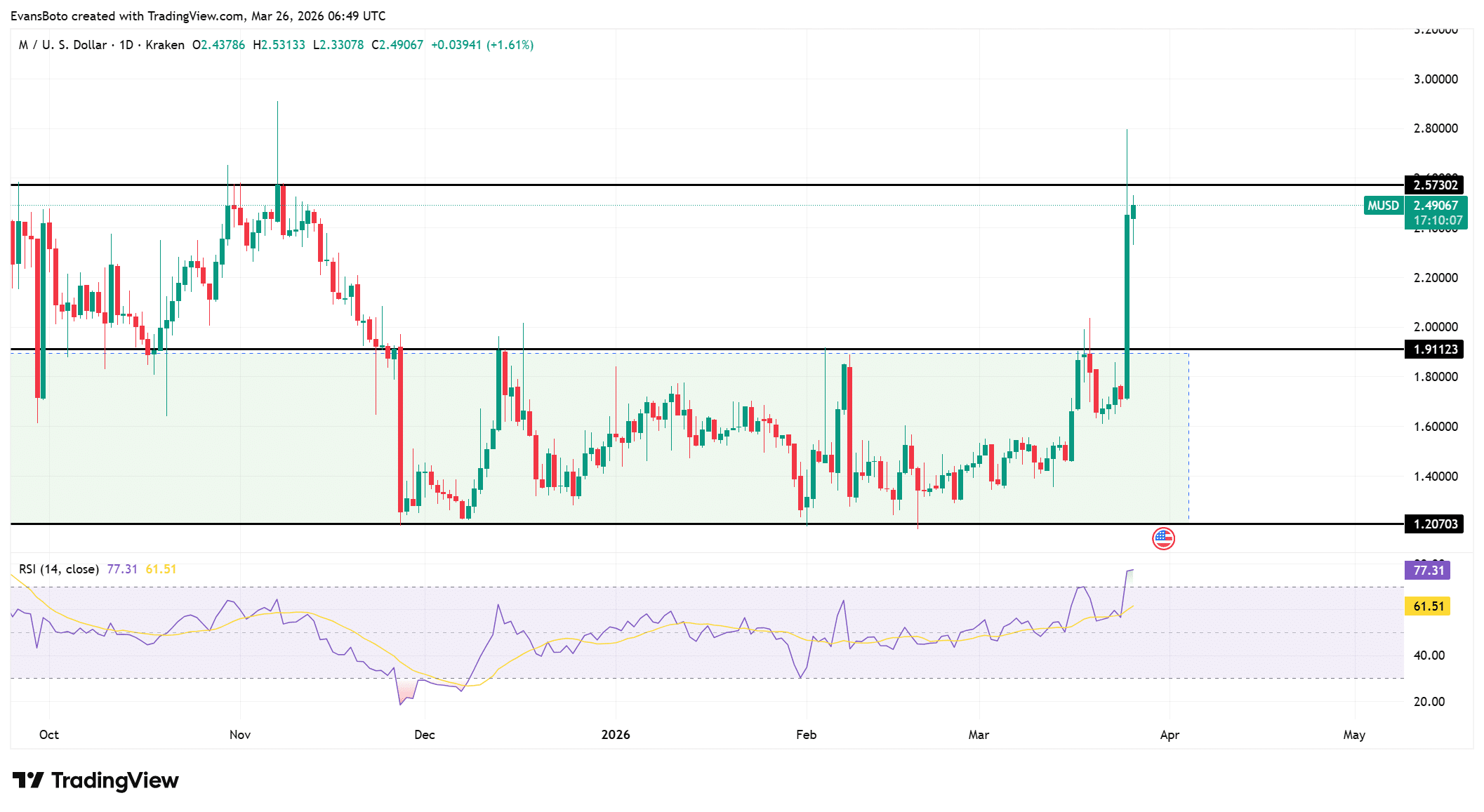 Level ini sekarang bertindak sebagai support, mengonfirmasi pergeseran struktural dari konsolidasi ke ekspansi. Grafik menunjukkan kisaran sideways yang berkepanjangan antara $1,20 dan $1,91 sebelum breakout, menyoroti bagaimana aksi harga yang terkompresi mendahului pergerakan.