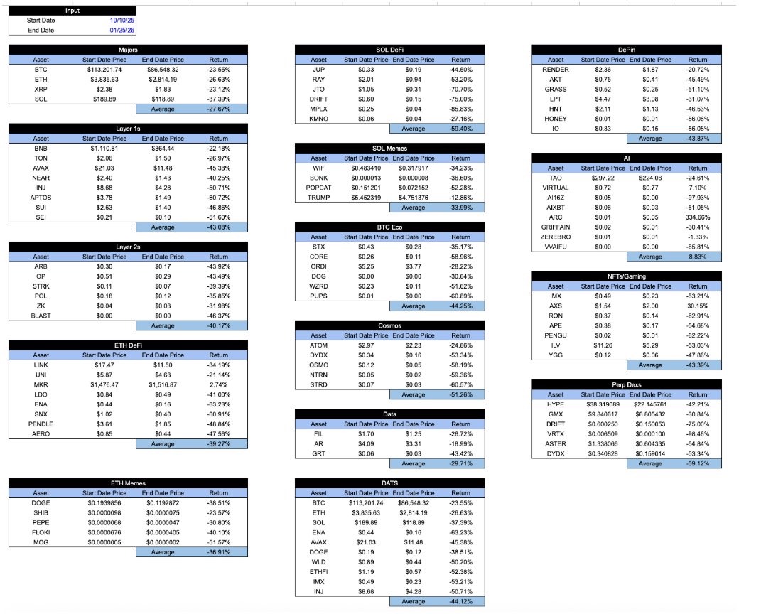 Maju cepat ke hari ini, semua aset yang "dikemas kripto" terlihat sama dalam hal pengembalian. Sejak flash crash 10 Oktober, tingkat penurunan berbagai sektor hampir tidak dapat dibedakan. Apa pun yang Anda pegang, atau bagaimana token tersebut menangkap nilai ekonomi, atau bagaimana trajectory proyek tersebut... tingkat pengembaliannya pada dasarnya sama. Ini sangat membuat frustrasi.