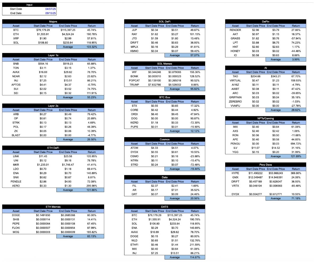 Di masa pasar yang makmur, tabel ini akan terlihat sedikit lebih menggembirakan. Token "baik" cenderung mengungguli token "buruk". Tetapi sistem yang sehat seharusnya sebaliknya: Anda ingin token yang baik juga berkinerja lebih baik di masa sulit, bukan hanya saat kondisi baik. Berikut adalah tabel yang sama dari titik terendah 7 April hingga titik tertinggi 15 September.