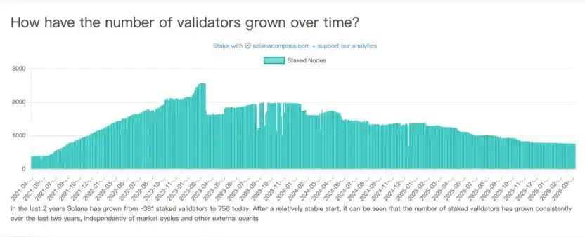 Jumlah node Solana telah turun 70% dari puncak sejarahnya. Awal April, menurut data Solana Compass, jumlah validator-nya turun drastis dari 2.560 pada Maret 2023 menjadi sekitar 756; pada periode yang sama, koefisien Nakamoto turun dari 31 menjadi 20, penurunan sebesar 35%, menunjukkan tingkat desentralisasi yang melemah.