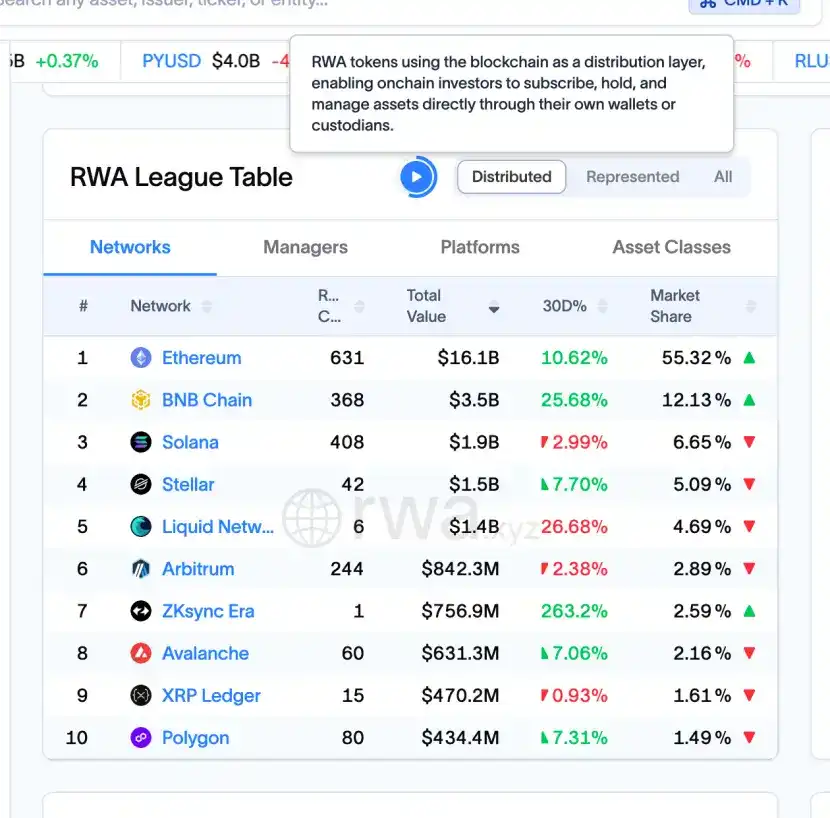 Menurut data RWA.xyz, Ethereum仍然占据主导地位 dalam nilai aset RWA, aset yang diterapkan on-chain超过16 miliar dolar AS,份额pasar超过55%; BNB Chain dengan 3,5 miliar dolar AS,份额12,13%位居第二; Solana dengan约1,9 miliar dolar AS,份额6,65%排名第三. Platform obligasi negara代币化besar端dan kredit privat端,多数仍部署在以太坊生态.