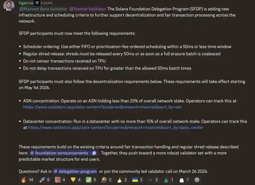 与此同时,规则还进一步收紧了验证者在执行层的自由度.包括要求在50毫秒内完成交易排序、按既定规则处理交易优先级,强制按节奏释放数据分片,并明确禁止对TPU接收的交易进行审查或延迟.这一系列约束,直指过去长期存在的MEV争夺和执行不透明问题,本质上是在压缩验证者的"操作空间",用更标准化的规则换取网络的一致性.
