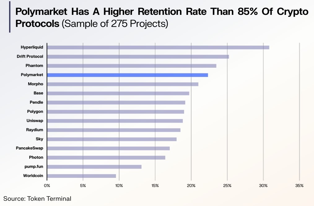 Tingkat retensi Polymarket versus entitas crypto. Sumber: Token Terminal
