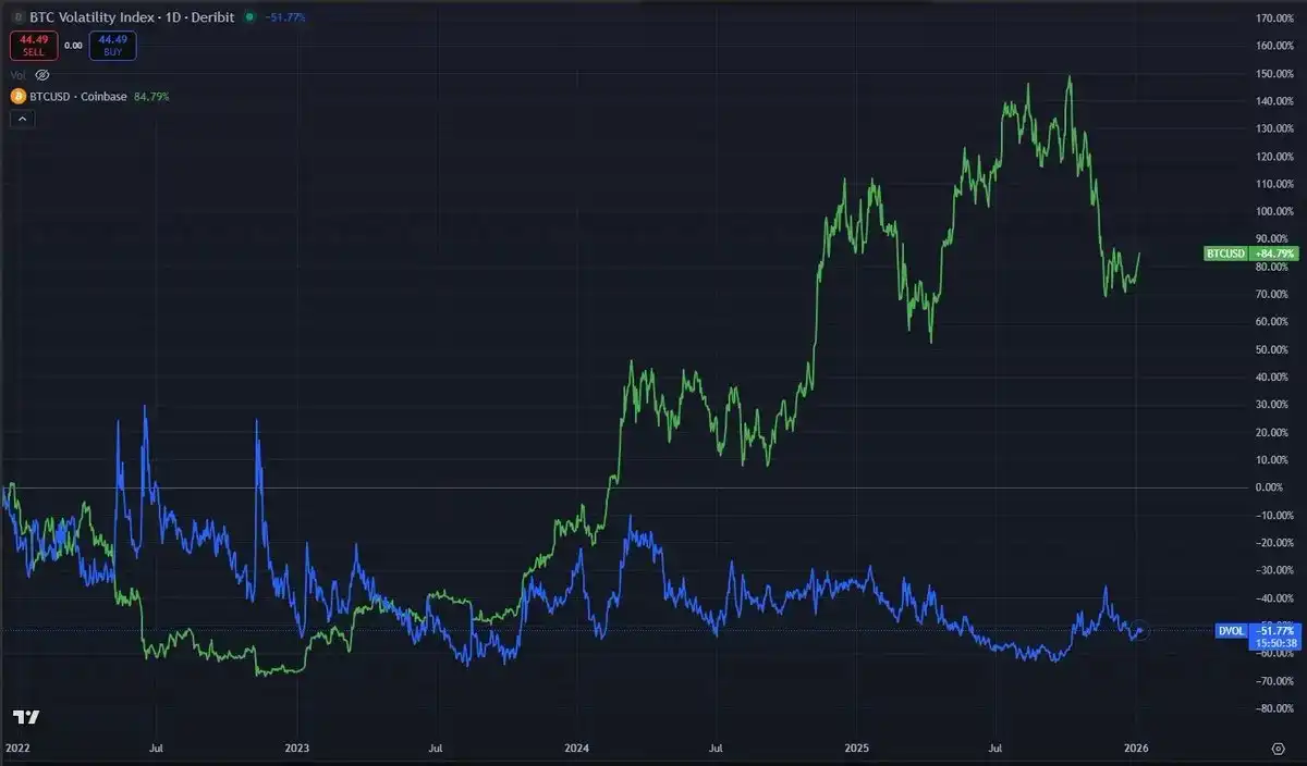 Pada Agustus 2025, ketika harga Bitcoin pertama kali menembus $120.000, DVOL mendekati titik terendah lokal. Pasar opsi tidak memberikan kompensasi yang cukup untuk risiko berkelanjutan.