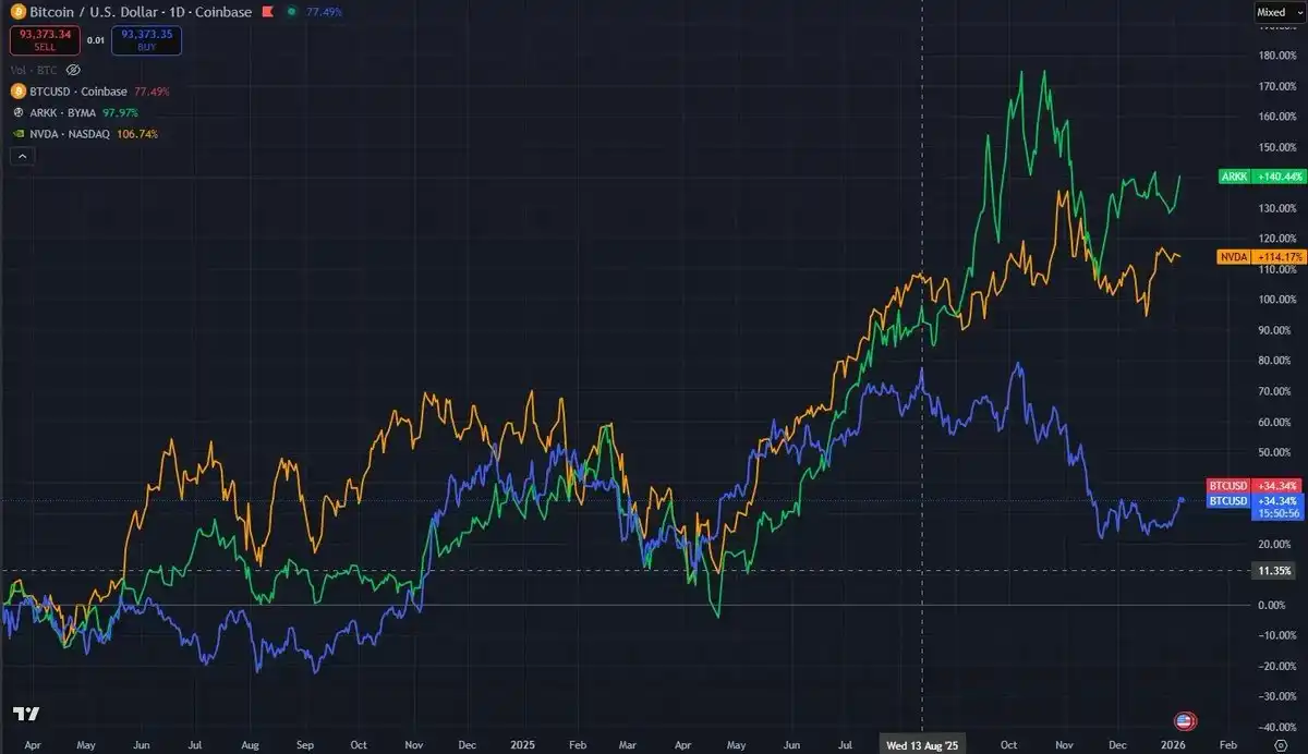 Bitcoin sebelumnya sangat berkorelasi dengan pergerakan saham teknologi AS, sampai sekitar Agustus 2025, Bitcoin mulai jelas tertinggal dari ARKK dan Nvidia, kemudian mengalami crash pada 10 Oktober, dan hingga kini belum menutup kesenjangan sebelumnya.