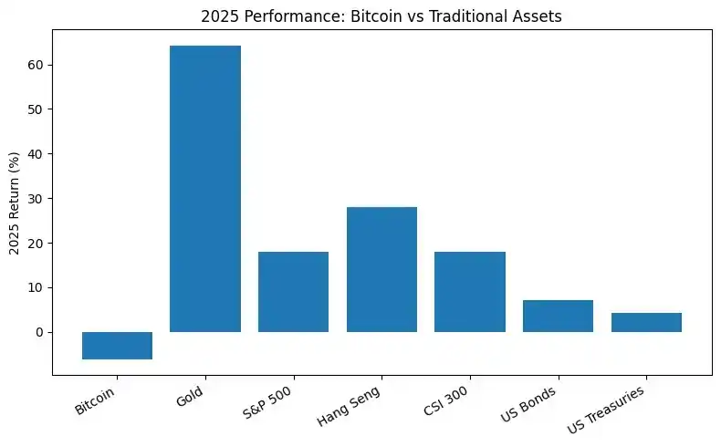 Meskipun lingkungan kebijakan ramah, kinerja Bitcoin pada tahun 2025 hampir kalah dibandingkan semua aset tradisional utama, termasuk emas, saham AS, saham Hong Kong, saham A, bahkan beberapa indeks benchmark obligasi.