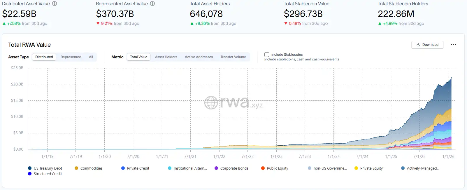 Data terbaru RWA.xyz mengungkapkan, hingga 23 Januari 2026, kapitalisasi pasar on-chain RWA mencapai $225,9 miliar, meningkat 7,58% dibandingkan periode yang sama bulan sebelumnya, pertumbuhan stabil; total jumlah pemegang aset meningkat menjadi sekitar 646,1 ribu, naik 8,36% dibandingkan periode yang sama bulan sebelumnya.