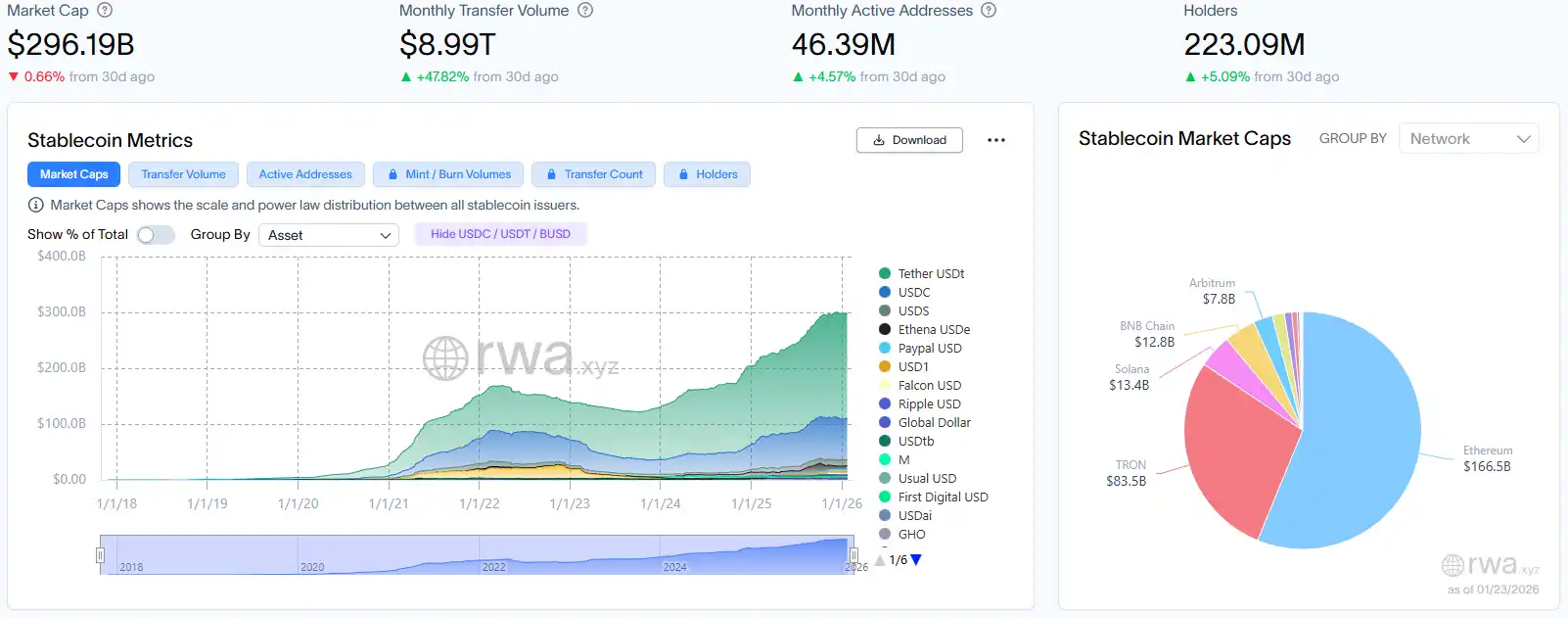 Kapitalisasi pasar total stablecoin menyusut menjadi $2.961,9 miliar, turun 0,66% dibandingkan periode yang sama bulan sebelumnya, mencerminkan masuknya dana baru mengering atau adanya tekanan arus keluar bersih; volume transfer bulanan melonjak menjadi $8,99 triliun, meningkat drastis 47,82% dibandingkan periode yang sama bulan sebelumnya, rasio perputaran (volume transfer/kapitalisasi pasar) melonjak signifikan menjadi 30,3 kali, menyoroti keunggulan likuiditas tinggi stablecoin.
