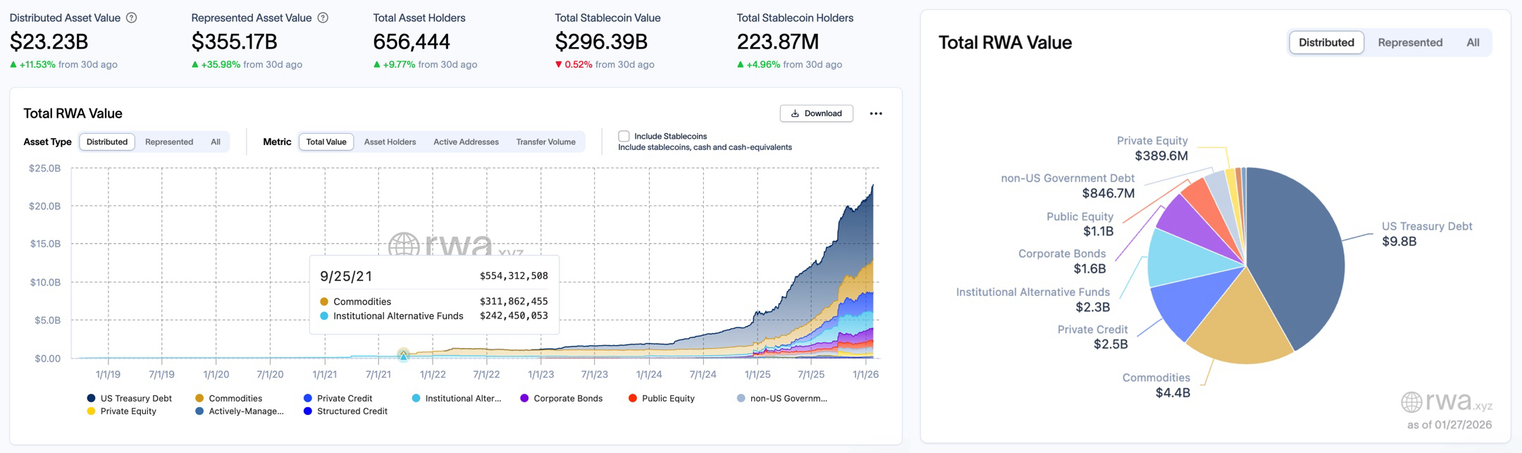 Menurut panel data rwa.xyz, hingga 27 Januari 2026, total nilai on-chain RWA (Distributed Asset Value) terus meningkat stabil, dari $216,6 miliar pada 20 Januari menjadi $232,3 miliar, peningkatan mingguan sebesar $7,6 miliar, kenaikan 3,51%. Volume pasar RWA yang lebih luas juga menunjukkan pemulihan signifikan, dari $3500,8 miliar naik ke $3550,8 miliar, bertambah $50 miliar, kenaikan 1,43%. Jumlah total pemegang aset meningkat dari 637.807 orang menjadi 656.444 orang, penambahan bersih mingguan 18.637 orang, kenaikan 2,92%. Sementara itu, pasar stablecoin mempertahankan pertumbuhan yang relatif stabil, jumlah pemegang meningkat dari 223,34 juta orang menjadi 223,87 juta orang, kenaikan 0,23%; kapitalisasi pasar stablecoin naik sedikit, dari $2996,4 miliar menjadi $2999,64 miliar, kenaikan 0,1%.