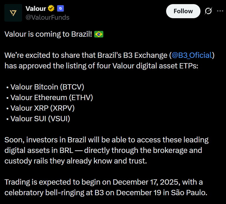 ASebelum peluncuran Solana, lineup ETP Valour di Brasil sudah menyediakan eksposur ke Bitcoin (BTC), Ether (ETH), XRP (XRP), dan Sui (SUI).