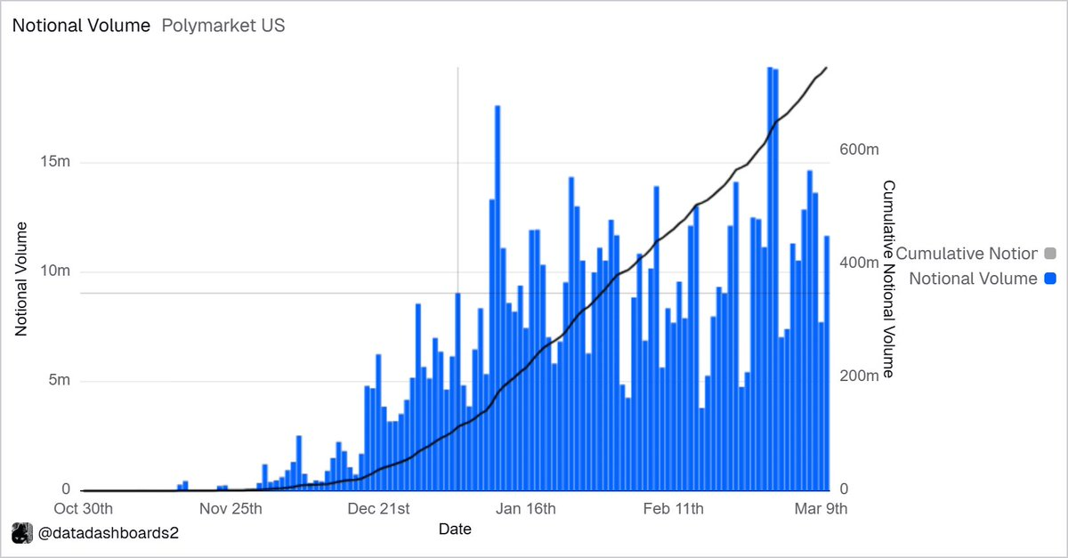 Sejak melanjutkan operasi di AS pada November lalu, hingga 14 Maret, volume transaksi nominal platform AS Polymarket telah menembus 750 juta dolar AS, dengan jumlah transaksi lebih dari 5 juta. Volume open interest platform sebelumnya一度 mencapai 2,6 juta dolar AS, dan baru-baru ini turun ke level sekitar 1 juta dolar.