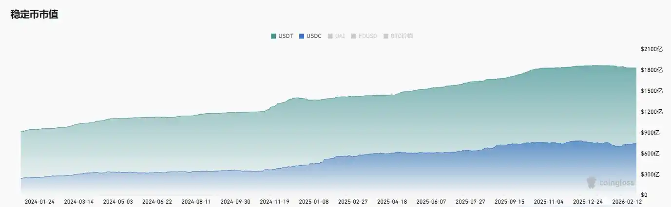 Selain itu, volatilitas整体 pasar crypto dan siklus makro仍 akan构成 ketidakpastian bagi laju pertumbuhan volume sirkulasi. Menurut data Coinglass, total kapitalisasi pasar stablecoin saat ini sekitar 2640 miliar dolar AS, USDC menyumbang sekitar 28.5%. Meskipun USDC memimpin industri dalam hal laju pertumbuhan, Tether masih mendominasi.