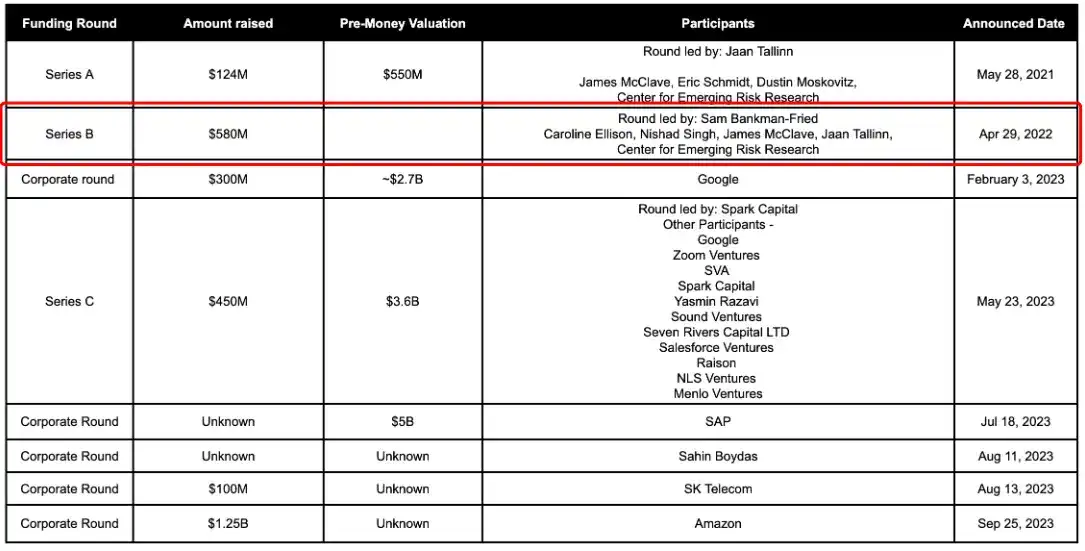 April 2022 (ini adalah tanggal pengumuman resmi, transaksi sebenarnya selesai pada tahun 2021), FTX menyelesaikan investasi terpentingnya di bidang AI — memimpin putaran pendanaan $580 juta untuk startup AI Anthropic dengan investasi $500 juta, kepemilikan saham一度 mencapai 13,56%, kemudian terdilusi menjadi 7,84% setelah Anthropic menyelesaikan beberapa putaran pendanaan.