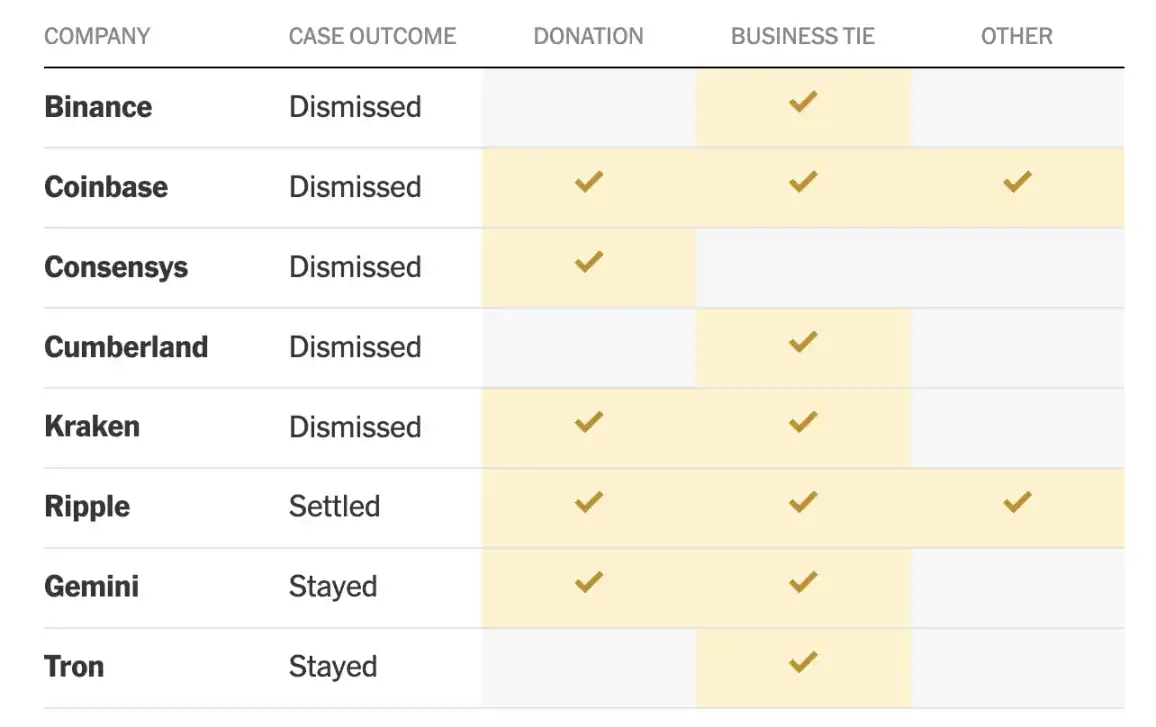 Saat ini belum ada bukti yang menunjukkan bahwa presiden pernah menekan SEC untuk memberikan keringanan kepada perusahaan cryptocurrency tertentu. The New York Times juga tidak menemukan bahwa perusahaan-perusahaan ini pernah mencoba mempengaruhi arah kasus dengan memberikan sumbangan politik atau menjalin kerjasama bisnis dengan Trump, sebagian aliran dana dan kerjasama bisnis bahkan terjadi setelah SEC menyesuaikan cara penanganan kasus.
