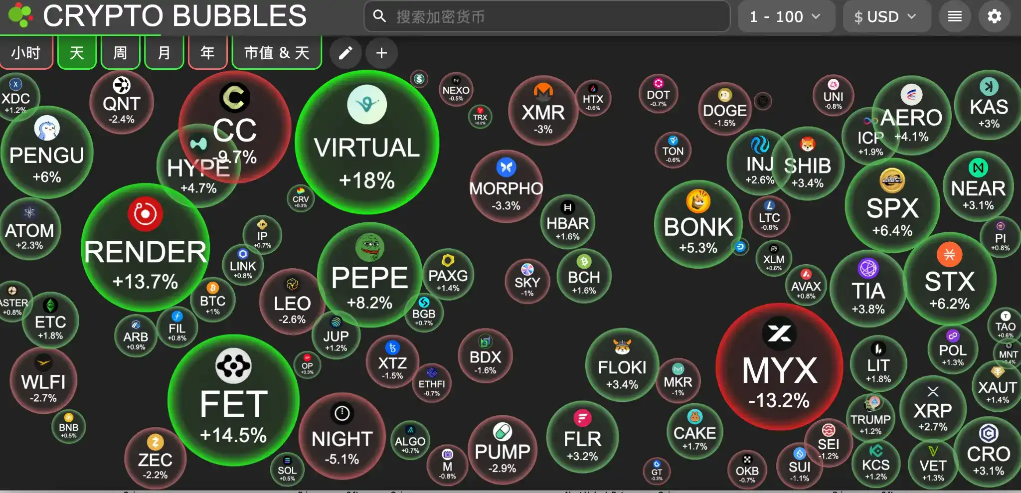 Kenaikan maksimal 100 koin teratas berdasarkan kapitalisasi pasar hari ini: Virtuals Protocol naik 18%, ASI Alliance naik 14,5%, Render naik 13,7%, Pepe naik 8,2%, SPX6900 naik 6,4%.