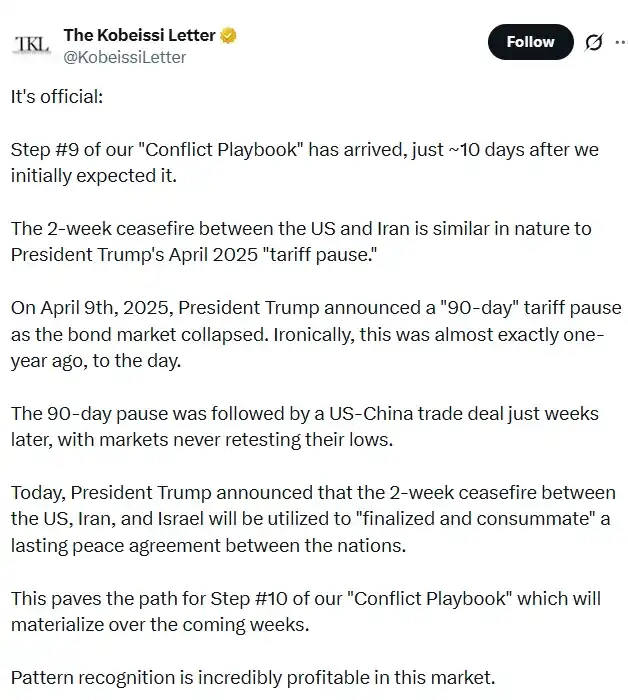 Lembaga penelitian makro AS The Kobeissi Letter terbaru menyatakan, dengan pengumuman Trump tentang kesepakatan gencatan senjata dua minggu antara AS, Iran, dan Israel, "skenario konflik" langkah kesembilan yang mereka lacak telah resmi tiba, yaitu pencapaian kesepakatan dan pembingkaian narasi, kedatangan ini sekitar 10 hari lebih lambat dari perkiraan lembaga tersebut sebelumnya.