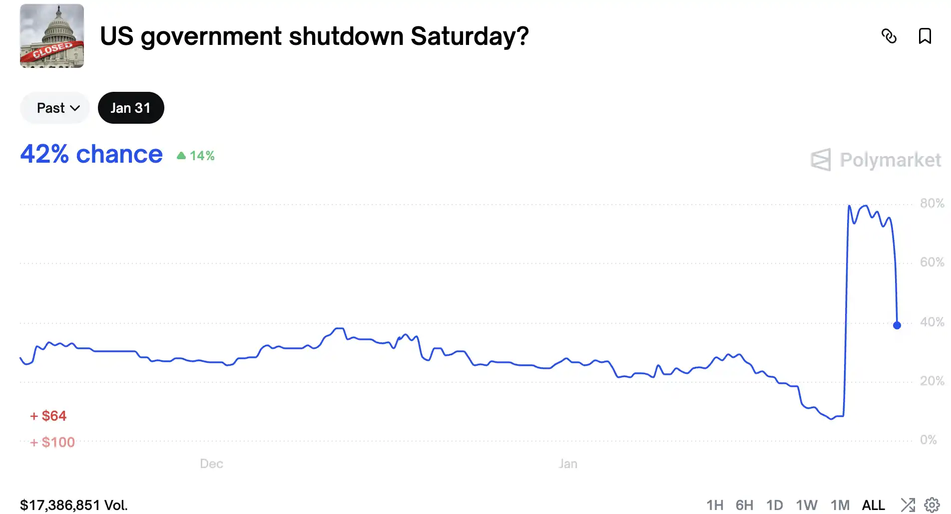 Keadaan saling berhadapan ini dan kedekatan tanggal kedaluwarsa RUU anggaran sementara membuat probabilitas penutupan pemerintah AS pada akhir Januari di pasar prediksi melonjak tajam. Namun, pagi ini, data Polymarket menunjukkan bahwa probabilitas taruhan penutupan pemerintah AS pada akhir Januari terus menurun, dan kini telah turun menjadi 42%, sebelumnya pernah mencapai titik tertinggi 80%.