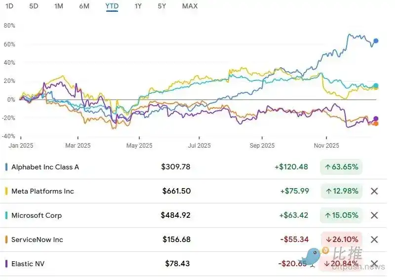 In the software and data space, performance diverged along another dimension: (1) Mandatory vs. (2) Optional. Platform-like enterprise systems embedded in workflows with mandatory renewals (like Alphabet, Meta) continued their compound growth, both rising year-to-date, as AI spending reinforced their existing distribution moats. ServiceNow and Datadog, despite strong products, saw returns dragged down by valuation pressures, bundling pressure from hyperscale cloud providers, and slower AI monetization. Elastic illustrates the adverse scenario: strong technical capabilities, but squeezed by cloud-native alternatives and deteriorating unit economics.