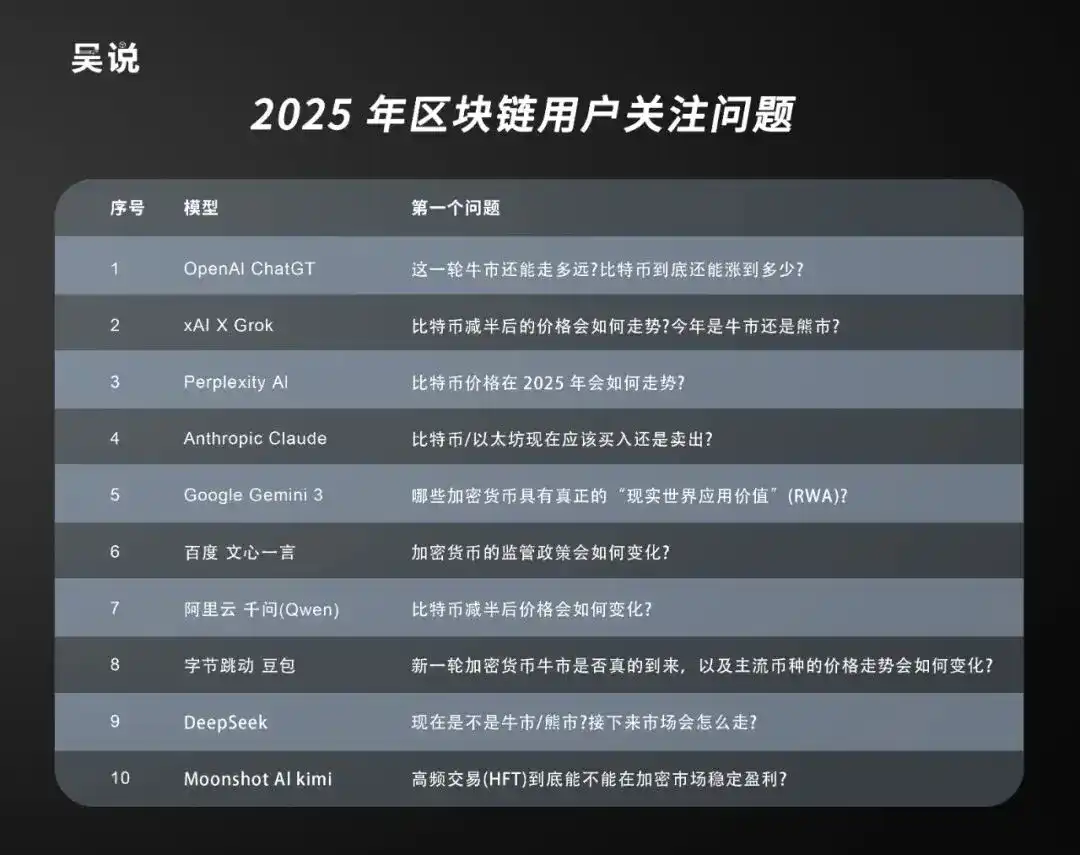 Alasan mengapa "tiga pertanyaan teratas" yang diberikan oleh model-model ini tidak sepenuhnya sama mungkin terkait dengan posisi dan konteks masing-masing. ChatGPT lebih seperti berdiri dari perspektif trader, mengorganisir diskusi menjadi rantai kecemasan yang terstruktur seperti "seberapa jauh siklus ini dapat berlangsung — apakah Alpha masih ada — apakah ada pemotongan struktural"; Grok lebih dekat dengan narasi pasar seperti halving, bull/bear, dan dana institusional ETF; Gaya Perplexity lebih seperti ringkasan pencarian, berfokus pada pergerakan harga, pencegahan penipuan, dan kemajuan ETF/regulasi; Claude lebih hati-hati, menekankan waktu beli/jual, kredibilitas proyek, dan manajemen risiko untuk pemula; Gemini lebih condong ke rute industri dan teknologi, memperhatikan RWA, dampak regulasi pada keamanan aset, dan "pilihan akhir" L2/Solana/AI. Model-model di wilayah Tiongkok secara keseluruhan lebih terpusat pada tiga "variabel deterministik paling keras" yaitu siklus, halving, dan regulasi, sementara Kimi relatif merupakan pengecualian, menyederhanakan pertanyaan ke detail eksekusi on-chain (keamanan dompet, slippage/MEV, HFT), lebih seperti gesekan nyata dari pengguna on-chain frekuensi tinggi.